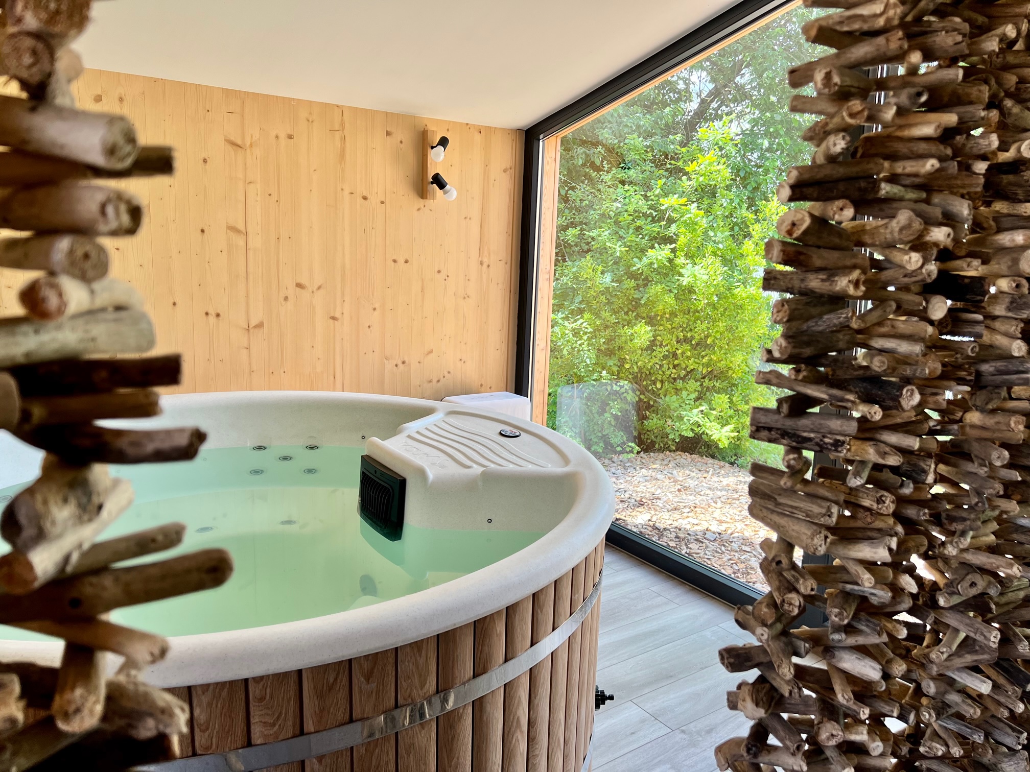 A private rowboat is at your disposal for freely exploring the water — also a fun and original way to reach the wellness area on the opposite shore (including several jacuzzis, included with your stay and accessible from 10 a.m. to 1 p.m. and from 2 p.m. to 7 p.m.).