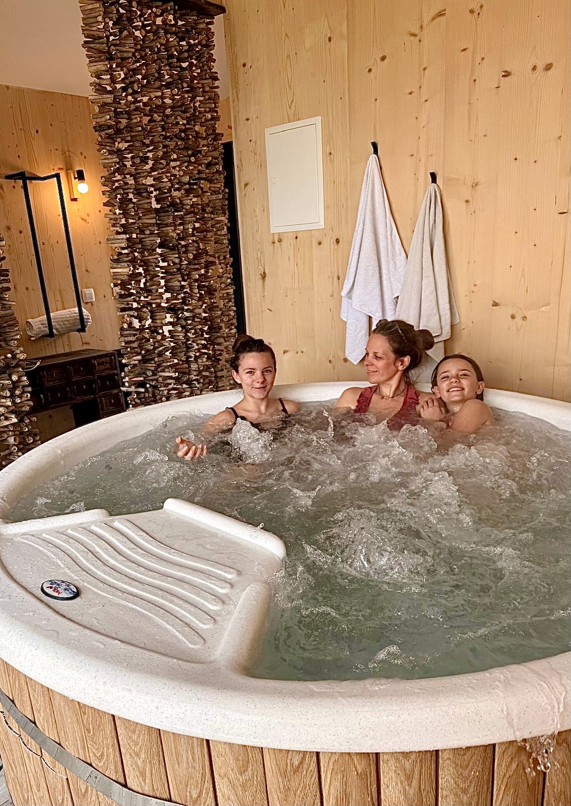 The cabin features a double bed on the ground floor and a mezzanine with three single beds — the perfect cozy nest for a small family seeking both originality and comfort.