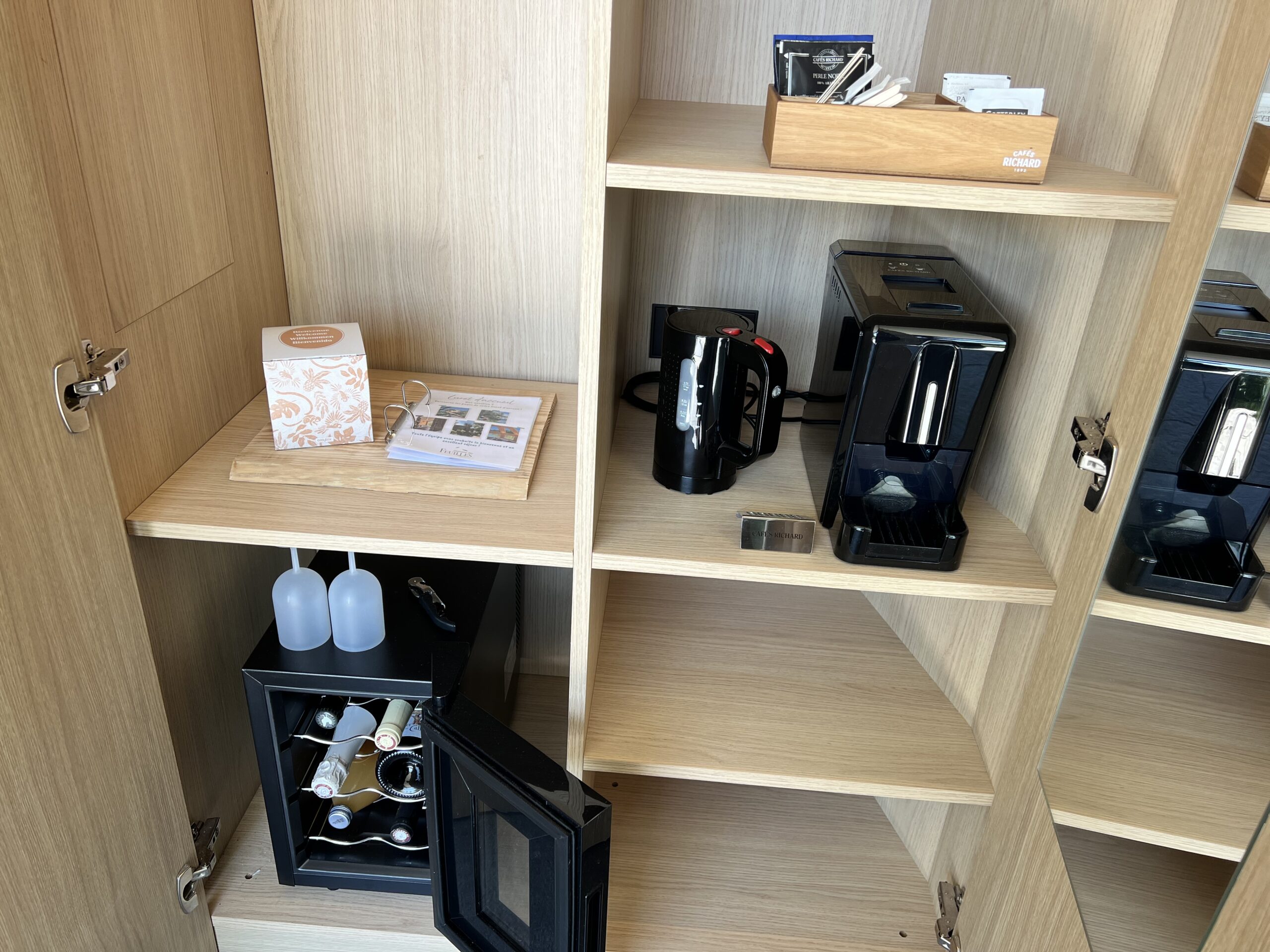 Equipée d’une cafetière, d’une bouilloire, d’une cave à vin avec une selection de boissons locales avec et sans alcool à diposition à la dégustation.