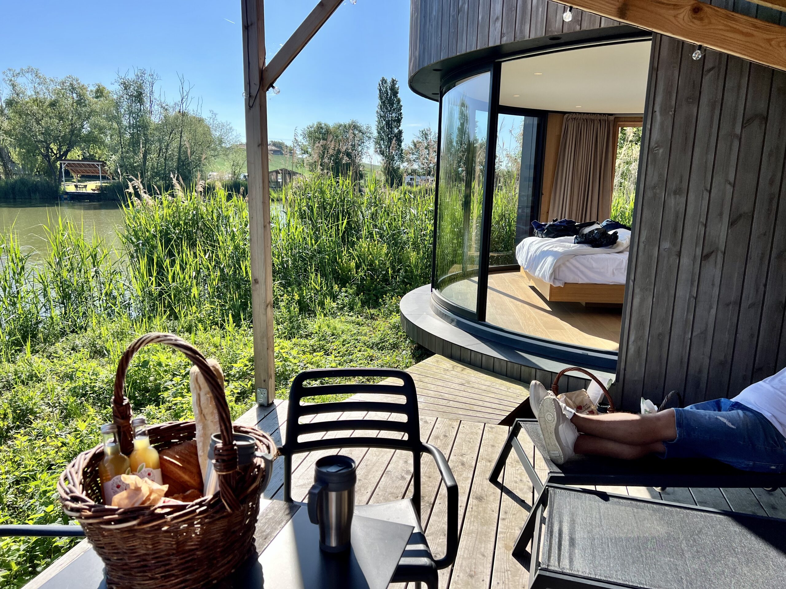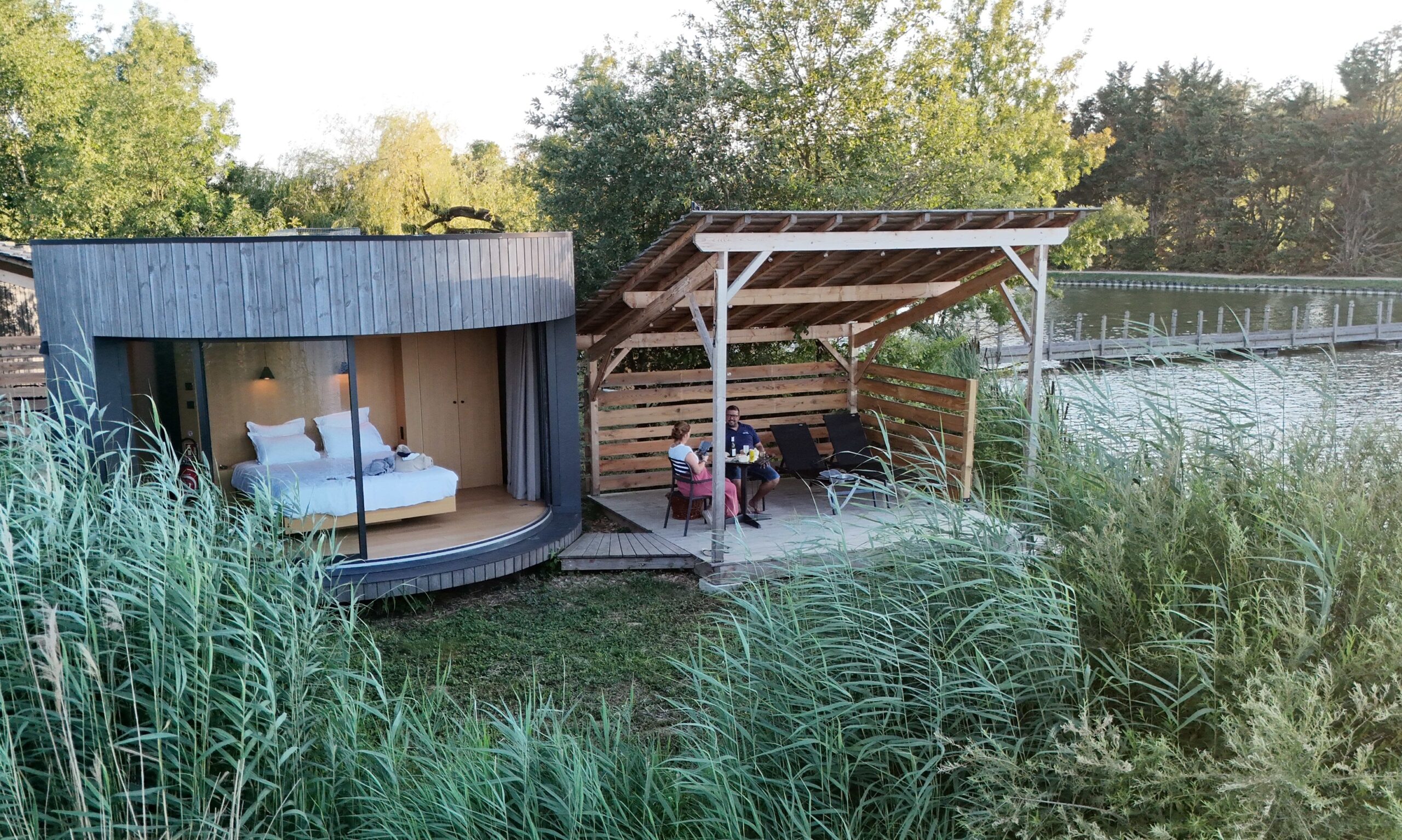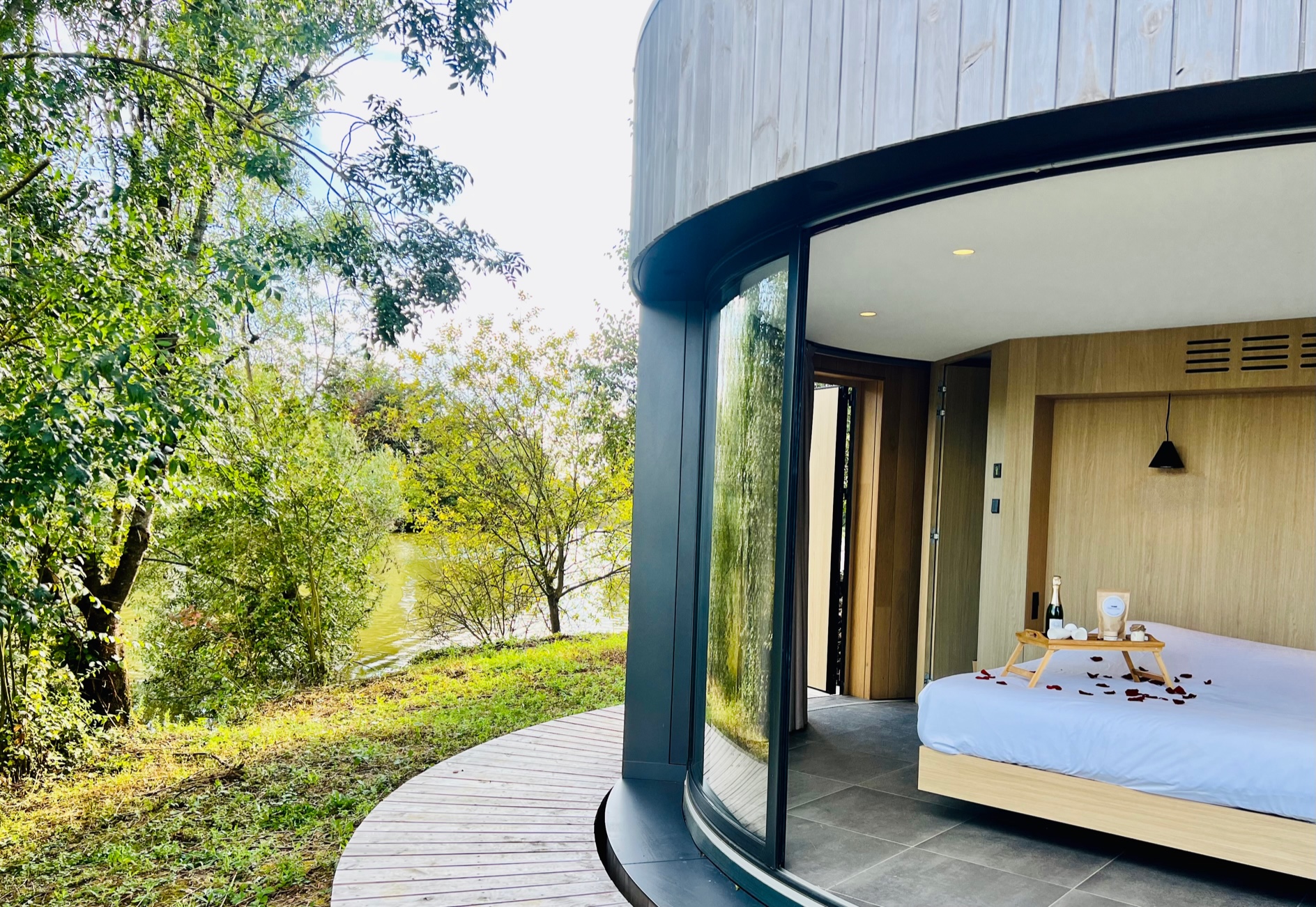 D’un simple geste, les baies vitrées courbées de la cabane s’ouvrent entièrement et la frontière dedans/ dehors s’efface pour laisser place à une expérience inédite. On vous garantie une reconnexion totale avec la nature et en prime une vue imprenable sur tout l’étang.